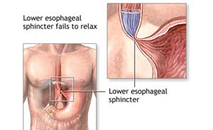 Achalasia may occur at any age, but is common in middle-aged or older adults. In achalasia, the lower sphincter fails to relax and open to let food pass into the stomach. The muscles of the lower half of the esophagus does not contract normally, i.e., peristaltic waves do not occur, thus, food is not propelled into the stomach. Factors causing achalasia are esophageal cancers, damage to the nerves of the esophagus, infection with a parasite, Chagas disease, and certain inherited factors.
