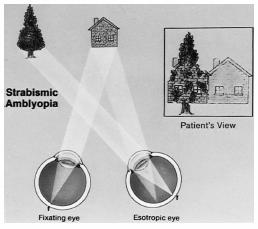 Refractive amblyopia: An unequal refractive error in both the eyes (anisometropia) gives rise to refractive amblyopia. Since the brain ignores the blurred images from the bad eye, only half the visual system develops normally, whereas the other half remains undeveloped.